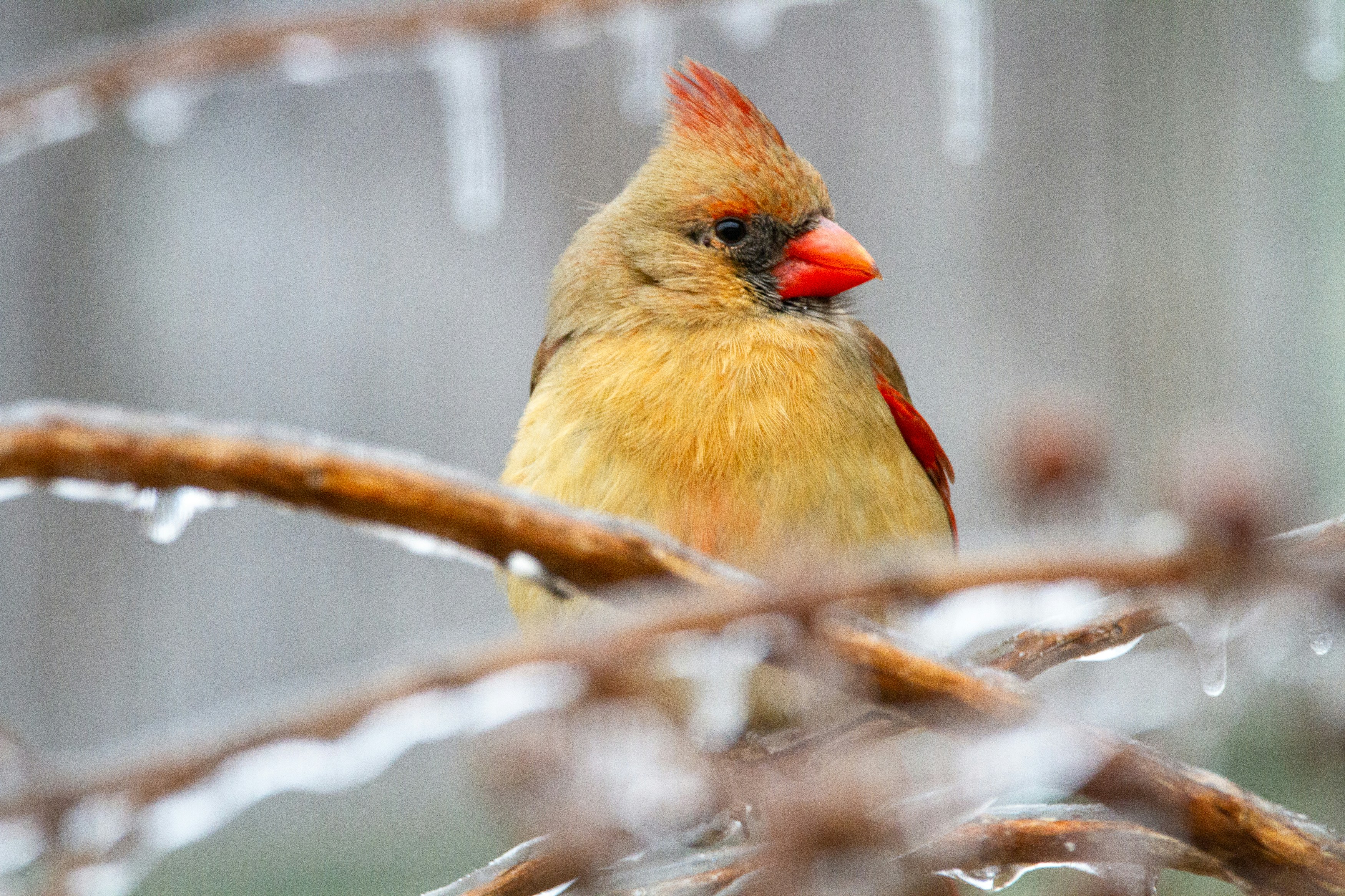 yellow and red bird on brown tree branch